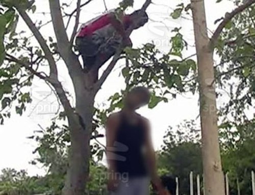 ขาวม้าแขวนคอตายกับต้นคูณในทุ่งนาหลังบ้าน