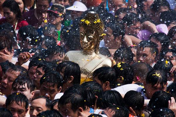 ร่วมกันประกอบพิธีอัญเชิญองค์หลวงพ่อพระใสออกจากพระอุโบสถ อัญเชิญองค์หลวงพ่อพระใส ประดิษฐานบนราชรถที่จัดเตรียมไว้ จัดเป็นรูปขบวนแห่รอบพระอุโบสถ 3 รอบ ในช่วงเวลาที่รอคอยมีผู้คนมากมายเตรียมอุปกรณ์ถังและขันใส่น้ำสะอาดเอาไว้ เพิ่มน้ำอบปรุงแต่งกลิ่นหอมด้วยดอกไม้นานๆพันธุ์ รวมจิตร่วมใจ ส่งมอบสายน้ำที่โปรยปรายเหมือนดังสายฝนให้ความสุขชุมชื่นทั่วบริเวณพื้นที่จัดงาน