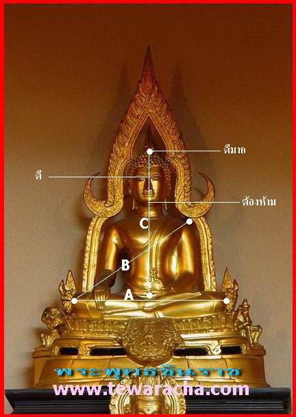 เส้นที่หนึ่งคือเส้น A เป็นระยะการวัดความยาวจากหัวเข่าข้างขวา ไปจนสุดหัวเข่าข้างซ้ายของพระพุทธรูป