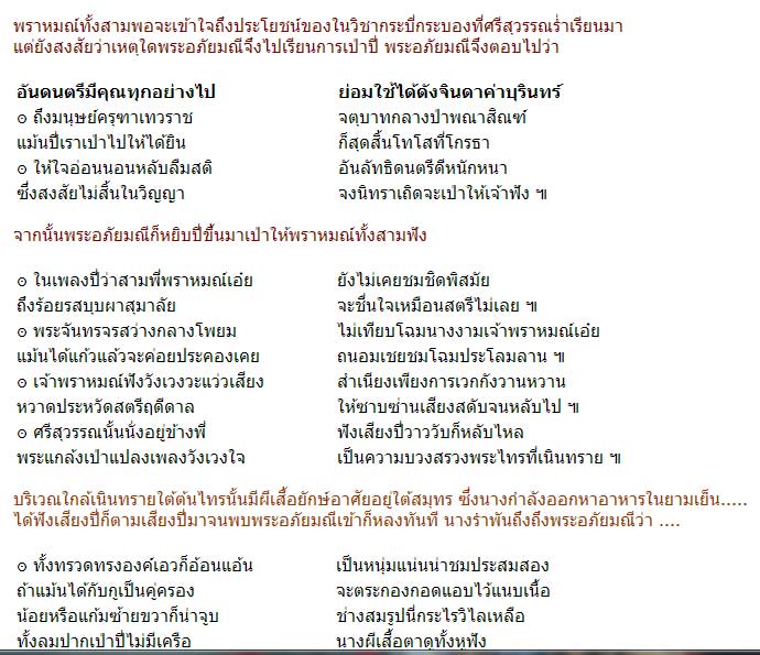 คือ พระอภัยมณีและศรีสุวรรณ พบกับสามพราหม์แล้วต่างก็ได้อวดวิชากัน ศรีสุวรรณเรียนวิชากระบี่กระบองทั้งสามพราหมณ์พอรับได้ แต่พระอภัยมณีนี่สิมันไม่เข้าท่าพระอภัยมณีก็บอกประมาณว่าวิชาเป่าปี่หรือวิชาดนตรีของเรานี่ไม่ธรรมดานะ ถ้าเป่าแล้วได้ยินถึงหูใคร ไม่ว่าจะเป็นใคร แม้แต่พวกครุฑ หรือท่านท้าวเทวดา ร้องไห้อยู่กลับหัวเราะได้ โกรธอยู่ก็หายโกรธได้ ฯลฯ พระอภัยมณี ก็เลยแสดงวิชาของตนโดยการเป่าเพลงทำไห้ ทั้งสามพราหมณ์และศรีสุวรรณหลับไป และ ณ บริเวณแห่งนั้นได้มีนางยักษ์ผีเสื้อสมุทรกำลังออกหากินอยู่ บังเอิญนางได้ยินเสียงปี่ จึงได้ตามเสียงปี่มาและได้พบ พระอภัยมณีนั่งเป่าปี่อยู่ ตกหลุมรักเลย ( เอาไปทำสามีเลย..)เรื่องราวสรุปโดยรวมประมาณนี้ แต่....เข้าประเด็นครับ อยากถามว่า พระอภัยมณีเป่าปี่ให้สามพราหมณ์และศรีสุวรรรนอนหลับแต่ทำไมนางยักษ์ไม่หลับ กลับหลงไหลในเสียงป๊่ (ขนาดเทวดาได้ยินยังหลับนา ) เล่นๆนะครับ |