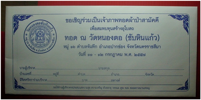 ***** ผมขออนุญาติตั้งราคาที่ขั้นต่ำ 100 บาท นะครับ โดยที่ท่านใดก็ตามที่ชนะการประมูลในรายการนั้นๆ ผมจะเขียน ชื่อ นามสกุล ของท่านลงหน้าซอง พร้อมจำนวนเงินทั้งหมดลงไปในซองผ้าป่าให้เรียบร้อย เงินทุกบาททุกสตางค์ของท่านจะนำไปทำบุญที่วัดหนองตอ (ซับหินแก้ว) ไม่มีการหักค่าใช้จ่ายใดๆ ทุกรายการที่ทุกท่านร่วมทำบุญนั้น จัดส่ง EMS ให้ทุกท่านครับ