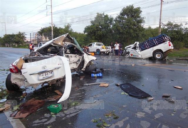 ในที่เกิดเหตุพบกระบะสีขาว หมายเลขทะเบียน ฒน 5690 กทม. จอดอยู่กลางถนน ในสภาพด้านหน้าพังยับเยิน โดยภายในรถ พบผู้ได้รับบาดเจ็บอาการสาหัส ติดอยู่ภายใน 1 รายทราบชื่อ คือ นายสิทธิพล น้อยอำไพ อายุ 38 ปี อยู่บ้านเลขที่ 440/55 หมู่ที่ 8 ต.บางเลน อ.บางเลน จ.นครปฐม เจ้าหน้าที่กู้ภัยต้องใช้เครื่องตัดถ่างนำออกมาส่งโรงพยาบาล นอกจากนั้น ห่างกันประมาณ 5 เมตร พบรถเก๋งโตโยต้า วีออส สีขาว หมายเลขทะเบียน กง 8878 สุพรรณบุรี จอดอยู่ในสภาพด้านขวาของรถถูกชนจนตัวถังงอ ตรวจสอบภายในรถพบศพนายชัยณรงค์ ยอดทัด อายุ 27 ปี อยู่บ้านเลขที่ 48 หมู่ที่ 3 ต.สนามชัย อ.เมืองสุพรรณบุรี จ.สุพรรณบุรี นอนเสียชีวิตติดอยู่ภายในรถ เจ้าหน้าที่กู้ภัยจึงต้องใช้เครื่องมือตัดถ่างนำร่างออกมาอีกคน