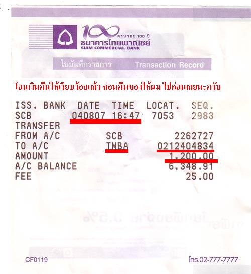 และเวลา 16.47น. ผมได้โอนเงินคืนให้คุณ praphon เรียบร้อยแล้วก่อนส่งพระคืนผมก่อนเลย(ส่งสลิปมาเป็นหลักฐานแนบ mail นี้แล้ว) + โทรแจ้งคุณ praphon