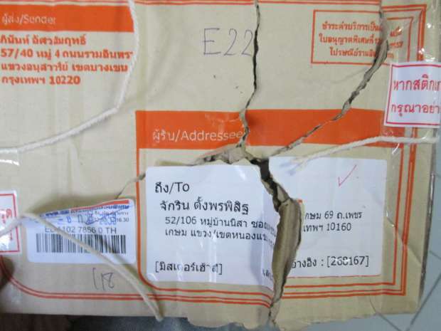 วันนี้คนที่บ้านบอกไปรษณีย์มาส่ง กล่องเป็นรูแบบโดนเจาะที่เหนือบนที่อยู่ผู้รับ ลักษณะเหมือนเจาะเพื่อจะส่องดูหรือจะเอานิ้วเล็กๆเข้าไปควานหาบางสิ่ง แต่ภาพในบรรจุกระดาษหนังสือพิมพ์อยู่ด้านบน คงควานหาไม่เจอ ถ้าจะเอาของภายในต้องฉีกหรือตัด เจาะกว้างๆกว่านี้ครับ