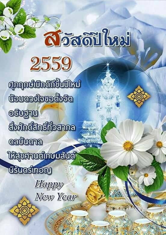 ในศุภวาระดิถีขึ้นปีใหม่ 2559 ขอให้บุญรักษา เทวดาคุ้มครองท่านและครอบครัว ขออาราธนาคุณพระรัตนตรัย และสิ่งศักดิ์สิทธิ์ทั้งหลายที่ท่านเคารพนับถือได้โปรดดลบันดาลประทานพรให้ท่านและครอบครัวประสพแต่ความสุข ความเจริญ สมหวังในสิ่งอันพึงปรารถนาทุกประการ มีสุขภาพพลานามัยแข็งแรงประสบความสำเร็จ ในหน้าที่การงาน มีแต่ความสุข ความเจริญ มีความร่มเย็น และมีความสุข ร่ำรวยเงินทองและทรัพย์สินตั้งแต่วันนี้และตลอดไป...สวัสดีปีใหม่