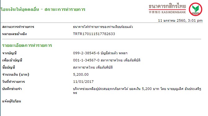 ผมได้นำเงินทั้งหมดที่ได้จากการประมูลไปบริจาคเพื่อช่วยเหลือผู้ประสบภัยพิบัติภาคใต้ผ่าน สภากาชาดไทย ตามที่ได้แจ้งไว้ในรายการประมูลดังกล่าวแล้ว รายละเอียดการโอนเงินตามสำเนาหลักฐานการโอนเงินที่ส่งมาด้วยครับ