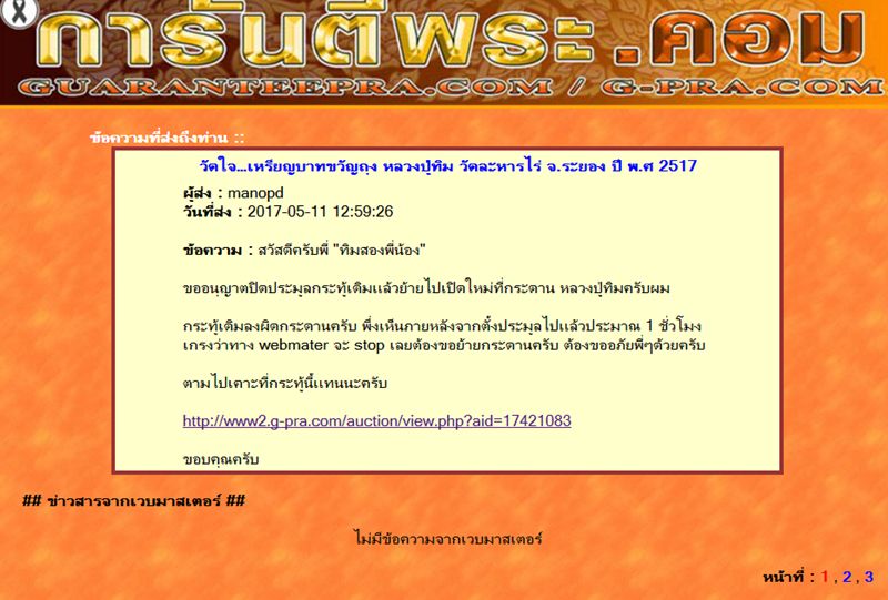 พร้อมกันนี้ก่อนที่กระทู้เก่าของเหรียญบาทขวัญถุงหลวงปู่ทิมจะถูกปิดประมูลลง ผมก็ได้ส่ง mailbox แจ้งเหตุผลการย้ายกระทู้ตั้งประมูลกับเพื่อนสมาชิก username ทิมสองพี่น้อง ที่ให้ราคาสูงสุดไว้ในกระทู้เก่า ได้ทราบเหตุผลอีกครั้งตามนี้ครับ