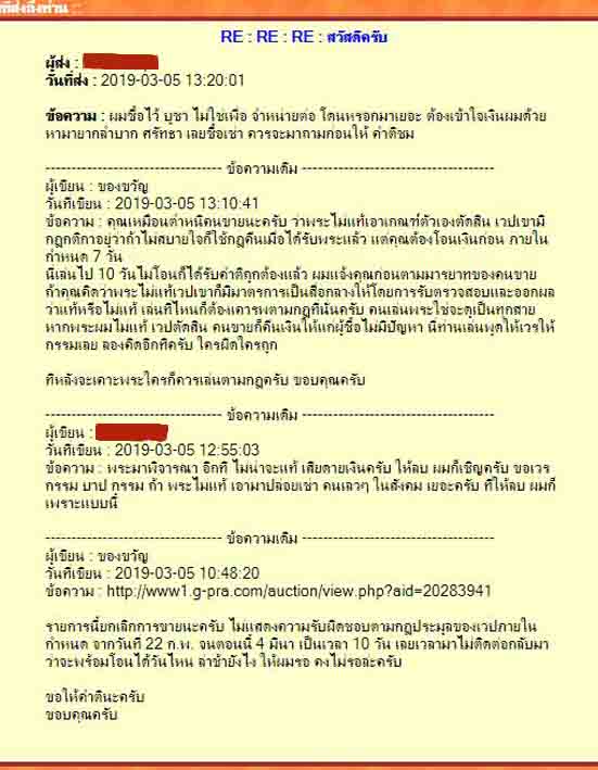 คือผมลงขายพระไปในเวป มีผู้ชนะประมูลผมในวันที่ 22 ก.พ. จนวันนี้ 5 มี.ค. ซึ่งก็เลยมาหลายวันตามกฎประมูล ผมเลยให้คำติสมาชิกท่านนั้นไป เพราะไม่แจ้งก่อนว่ายังต้องการอยู่ไหม หรือโอนล่าช้า หรือให้ส่งพระออกบัตร ถ้ามีการแจ้งกันก่อนผมก็รอได้ เคยมีหลายครั้งที่ผู้ชนะประมูลผมขอโอนล่าช้า หลังจากให้คำติไปแล้ว ผมเลยแจ้งเข้าไปในกล่องข้อความเพื่อให้สมาชิกท่านนี้ทราบจะได้ไม่ต้องโอนเงิน คำตอบที่ได้รับกลับมาคือการเขียนในทำนองผมขายพระเก๊ บาปกรรมมีจริง ผมจึงแจ้งว่าถ้าท่านคิดว่าพระเก๊ก็สมควรให้เวปตรวจสอบ หรือส่งสถาบันที่มีมาตรฐานไม่ใช่พูดลอย ๆ แบบนี้ ถ้าเก๊ผมในฐานะผู้ขายก็พร้อมคืนเงินหรือท่านได้รับพระแล้วไม่พอใจ ก็ส่งคืนได้ตามกฎรับประกันความพอใจ แต่นี่เล่นไม่โอน 11 วัน ยังต่อว่าผมอีกว่าต้องบอกกล่าวกันก่อนในการให้คำติ