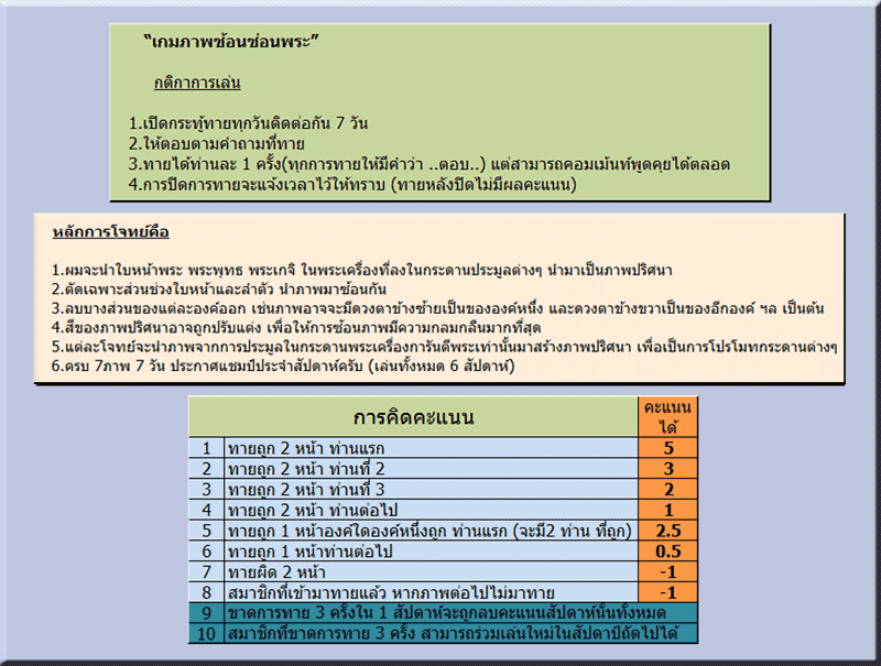 **อย่าลืมเข้ามาร่วมสนุกพูดคุย และทายเกม ภาพซ้อนซ่อนพระ สนับสนุนรางวัลโดยผู้ใหญ่ใจดี สำนักงานการันตีพระ