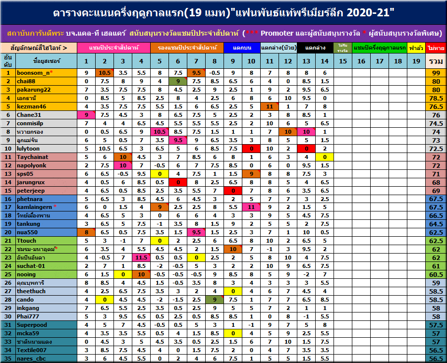 ผ่านสัปดาห์ที่ 14 ไปแล้วครับ คะแนนท่านใดเป็นอย่างไรดูจากตารางได้เลยครับ