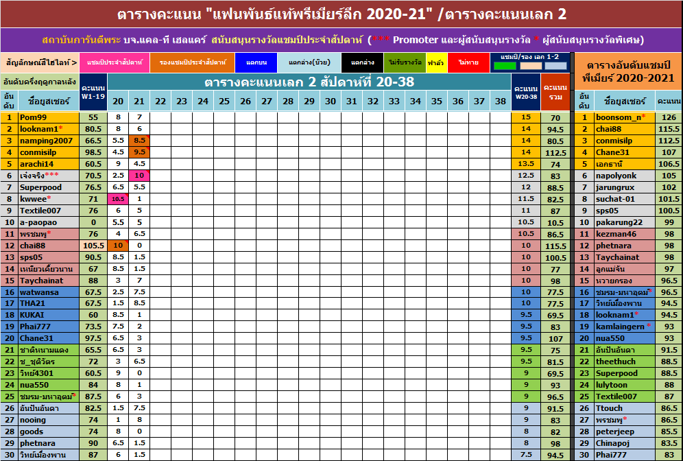 จบสัปดาห์ที่ 21 จัดอันดับตารางคะแนนได้ดังนี้ (ตามภาพ)