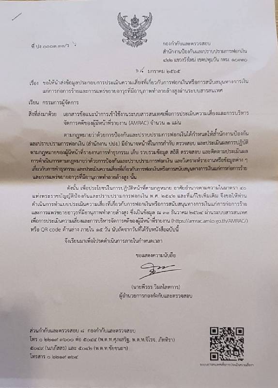 ทางปณ.ไทย และปปงบอกไม่มีการส่ง จม.ดังกล่าว" |