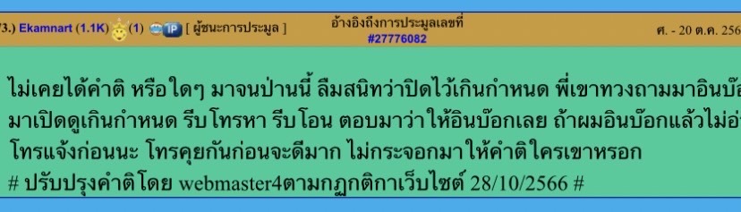 ผมโดนติ เนื่องจาก เกินกำหนด ผู้ตั้งประมูล ติดต่อในอินบ๊อก บอกไร้การติดต่อจากผม (โทรเตือนผมสักครั้งก็ยังดีว่าเกิดอะไรขึ้น ถ้าผมจงใจก็ติมาเลย) ผมเปิดมาเห็นรีบโทรหาผู้ตั้ง แต่ผู้ตั้งไม่คุยบอกให้อินบ๊อก