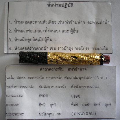 จนไม่มีเวลาปลีกตัวไป เจ้าน้องคนนี้อดรนทนไม่ได้จึงต้องหาเวลาไปเอง ซึ่งผมเคยบอกน้องเค้าไว้ว่าหากไปให้ขอเผื่อให้ด้วย 1 ดอก ซึ่งน้องเค้าก็รับปากและอาสาที่จะลองตะกรุดด้วยการให้หลวงพ่อลองฟันและกรีดดู น้องเค้าไปที่วัดเมื่อประมาณ 2 อาทิตย์ที่ผ่านมา แล้วนำตะกรุดกลับมาให้ 1 ดอกเป็นตะกรุดดำ และเล่าถึงสภาพวัด และปฏิปทาของหลวงพ่อ และเล่าด้วยว่าปัจจุบันนี้หลวงพ่อเริ่มอายุมากขึ้น สายตาไม่ค่อยดีแล้ว ถ้าใครไปขอตะกรุดแล้วตั้งใจที่จะลองจึงจะลองให้ และเงินที่ได้จากการบริจาคก็เข้าวัดทั้งหมด จึงแจ้งข่าวมายังชาว G-PRA เพื่อที่อย่างน้อยผมยังไม่มีโอกาสไปกราบท่านด้วยตนเองจะได้มีโอกาสสร้างประโยชน์ ให้กับทางวัดบ้าง ใครสนใจไม่ต้องติดต่อมาที่ผมนะครับ มีตะกรุดแค่ดอกเดียวที่น้องเค้าให้มาเท่านั้น ลองติดต่อไปที่หลวงพ่อท่านเองนะครับ ที่หลวงพ่อจำลองวัดเจดีย์แดง จังหวัดพระนครศรีอยุธยา โทร. 01-638-5761