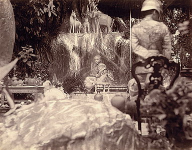 2. พระบาทสมเด็จพระจุลจอมเกล้าเจ้าอยู่หัวทรงยืนหันพระปฤษฎางค์ให้กล้องในการพระราชพิธีโสกันต์ ณ เขาไกรลาส ในสวนขวา พระบรมมหาราชวัง มีน้ำตกบ่อน้ำ และสัตว์ส่วนหนึ่ง ที่มีคติความเชื่อว่าอยู่บนเขาไกรลาส ในป่าหิมพานต์ คือ ม้าราชสีห์ ช้าง และ โค สัตว์เหล่านี้หล่อด้วยโลหะและมีน้ำพุ่งออกจากปาก เพื่อสรงน้ำพระราชโอรส พระราชธิดาที่ทรงรับพระราชทานโสกันต์ เมื่อปี พ.ศ. 2433