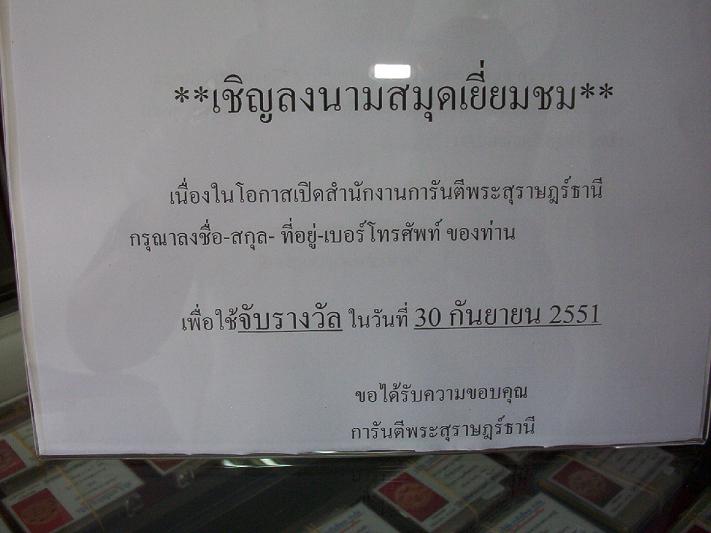 ......การันตีพระสุราษฎร์ธานี...จัดรายการพิเศษ...โอกาสเปิดสาขา....แจกรางวัลสำหรับผู้มาเยี่ยมชม..ลงนามในสมุดเยี่ยม..การันตีพระสุราษฎร์ธานี...เป็นโอกาสดีของชาวสุราษฎร์ธานีและแขกผู้มาเยี่ยม....จับรางวัลผู้โชคดี30กันยายน...มี3รางวัล..คุณสุมาลี ผู้จัดารสาขาบอกว่ารางวัลยังไม่เปิดเผย..แต่รางวัลใหญ่แน่นอน(ไม่ใช่..ไข่เค็มนะครับ)......แหมผู้จัดการใจดีอย่างนี้รับรองได้ว่า....การันตีพระสุราษฎร์ธานี...รุ่งเรืองแน่นอนครับพี่น้อง...........  |