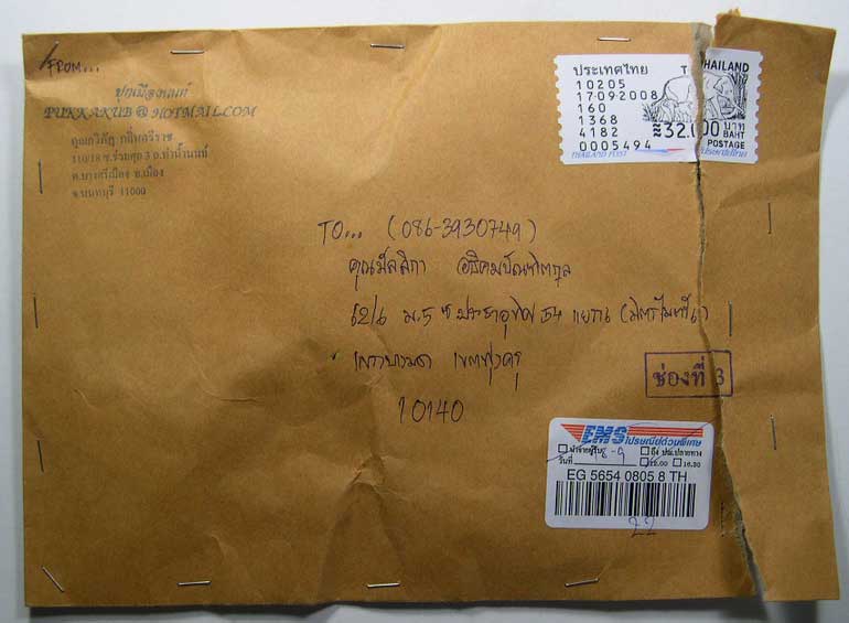 เมื่อค่ำผมเพิ่งถึงบ้านและได้รับห่อพัสดุจากพระที่ประมูลใน G-Pra 2 ชิ้น ชิ้นหนึ่งเป็นของพี่มิวพรพระพรหม (ขออนุญาตเอ่ยนามซึ่งเรียบร้อยดีและผม Feedback ให้ไปแล้ว) กับอีกชิ้นหนึ่งของพี่ ซึ่งปรากฎว่าตอนแรกที่เห็นซองของพี่ผมก็ในคอไม่ค่อยจะดี เพราะพระเนื้อผงเลี่ยมพลาสติคอยู่ภายใน (ขออนุญาตใช้ภาพประกอบ) |