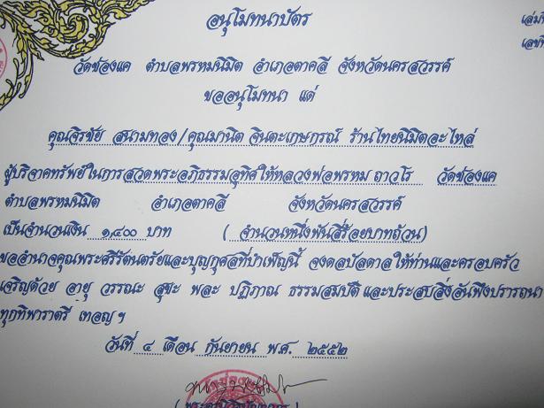 ใบอนุโมทนาบัตรของทางวัดช่องแคครับผม ที่พี่ได้ร่วมประมูลภาพถ่ายแจกทานไพ่ป็อกปี 12 หลังยันต์ครับผม (กระดาษซีเปีย) ผมได้นำเงินจากการประมูลนี้ไปร่วมสวดอภิธรรมให้กับหลวงพ่อพรหมในวันพระที่ 4 ก.ย. 52 แล้วครับผม ขอขอบคุณมากครับสำหรับการร่วมอนุโมธนาบุญในครั้งนี้ครับผม |