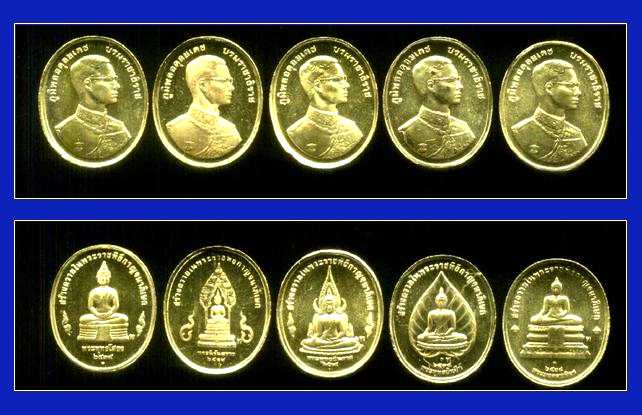 1 ชุดจะมี 5 เหรียญ ด้านหน้าเป็นรูปรัชกาลที่ 9 ด้านหลังเหรียญจะเป็น 5 พระพุทธรูปคู่บ้านคู่เมือง ได้แก่