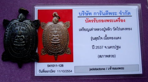 | หัวข้อกระทู้ : หลวงปู่่หลิว รุ่นสุขใจ เนื้อนวะโลหะแต่บัตรรับรองออกเป็นเนื้อทองแดง(ข้อผิดพลาดที่ไม่ควรให้....) |