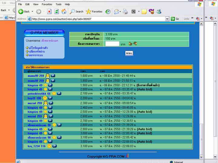 เมื่อตอนดึกของวันที่ 7 มีนาคม แล้วทางweb มีปัญหา โปรแกรมร่วนไปหมด ทำให้ผมใส่ราคาเท่ากับพี่ kru_1234 ที่ 3100 แล้วเมื่อคืนผมพยายามติดต่อพี่ kru_1234 แต่ติดต่อไม่ได้ และเพื่อความสบายใจของทุกฝ่ายเพราะไม่ใช่ความผิดใครเลย ผมขอแจ้ง การสละสิทธิในการประมูลครั้งนี้นะครับ อีกอย่างมาดูตอนเช้าแล้วผู้ประมูลได้คือพี่ kru_1234 ที่ ราคา 3100 เท่ากัน
