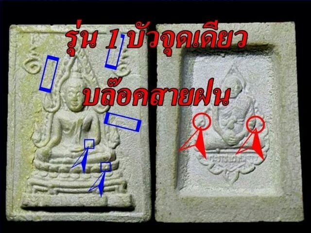 พระคำข้าวบล๊อคสายฝน ถ้าเป็นรุ่น 1 ด้านหลังจะมีตำหนิที่วงไว้ให้เห็น