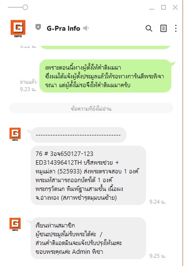 รายการนี้ผมแจ้งท่านแล้วครับ ให้ทางการันตีพระพิจารณาอยู่ท่านไม่น่ารีบให้คำติผมขนาดนั้นครับ เพราะผลออกวันที่ 29 ม.ค 65 ผม ก็แจ้งท่านเลยว่าขอให้ทางการันตีพิจารณาเพราะพระระบุชำรุดขอบ นี้เพิ่งวันที่ 3 หลังจากปิดประมูล รายการนี้สรุปผมไม่รับครับ ขอบคุณครับ |