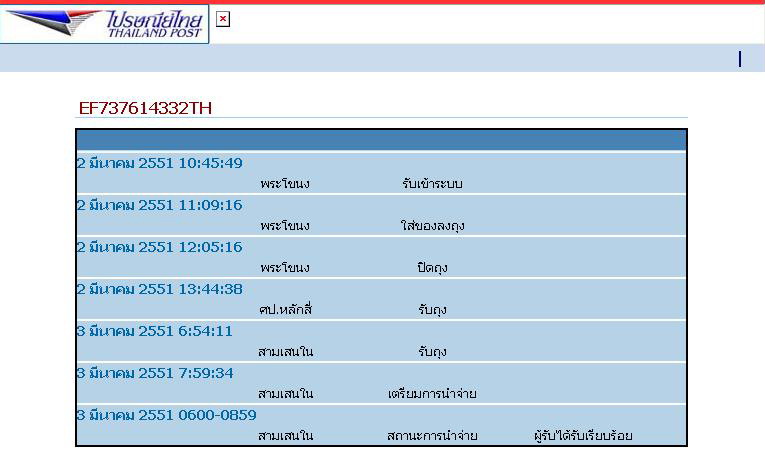 และผมได้จัดส่งพระให้คุณก่อนโอนเงิน เมื่อวันที่ 2/3/2551 หมายเลข EMS เลขที่ EF 7376 1433 2 TH ส่งไปที่ คุณเมธัส จันทร์ทอง 185/1 พระราม 6 ซอย 28 ถนนพระราม 6 แขวงสามเสนใน เขตพญาไท กทม 10400 และมีผู้รับเรียบร้อยแล้ว เมื่อวันที่ 3/3/2551 แต่ จากการตรวจสอบบัญชีของผม หมายเลข 253-2-01677-3 ออมทรัพย์ ไทยพาณิชย์ สาขาย่อยลาดพร้าว 71 ปรากฏว่าจนถึงวันที่ 8/3/2551 ยังคงไม่มียอดเงินจำนวนดังกล่าวโอนเข้ามา หากคุณได้ทำการโอนเงินให้ผมเรียบร้อยแล้ว ช่วยจัดส่งเอกสารสลิปการโอนแจ้งให้ผมทราบด้วยนะครับ ส่งเมล์มาได้ที่ toiting@ramthep.com |