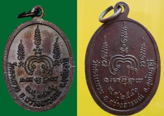 ด้านหลังเหรียญเก๊อยู่ขวามือเช่นเดียวกันมีหลายจุดเลยครับที่แตกต่างดูตามเส้นวงกลมสีขาวที่ผมวงไว้ |