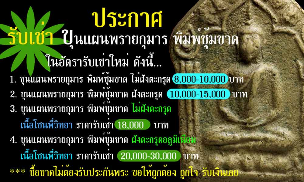 ประกาศรับเช่าขุนแผนพรายกุมาร พิมพ์ซุ้มขาด ทุกสภาพ โดย พระถูกต้อง ถูกใจ รับเงินทันที ตามอัตราราคารับเช่า ที่ประกาศดังนี้ครับ ท่านที่จะเสนอขาย รบกวนโพสภาพพระในหน้ากระทู้นี้ได้เลยครับ ขอให้เป็นภาพที่ชัดเจน ทั้งด้านหน้า และ ด้านหลัง ยิ่งเป็นภาพที่ถ่ายจากสตู จะพิจารณาเป็นพิเศษ ทิ้งเบอร์โทรติดต่อไว้ได้เลยครับ หากถูกใจภาพใด พิจารณาแล้วใช่ จะติดต่อกลับ ซื้อจริง เช่าจริงครับ