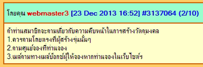 การตั้งกระทู้สอบถามความคืบหน้าในการจัดสร้าง ไม่ว่าเป็นพระเครื่อง เครื่องราง หนังสือ ที่อยู่ในระหว่างการจัดสร้าง ฯลฯ ตามกฏแล้วไม่สามารถตั้งกระทู้สอบถามได้ ไม่ว่าจะเป็นกระดานไหน ตั้งกระทู้ก็จะโดนลบกระทู้ครับ การสอบถามความคืบหน้านั้น ทางเว๊ปกำหนดวิธีปฏิบัติไว้ดังนี้ครับ