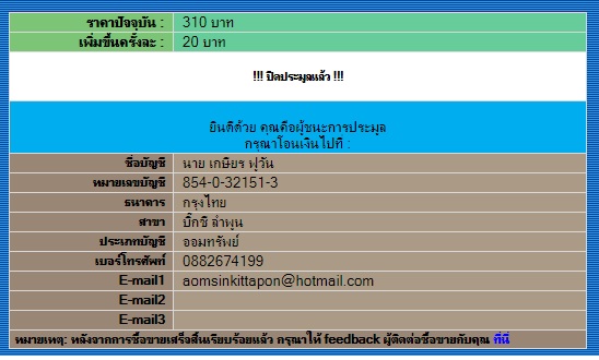 โอนเงินเรียบร้อยแต่ไม่มีความเคลื่อนไหว ในการส่งพระ โทรไปไม่รับแต่โทรกลับ ว่า ส่งให้แล้วแต่ไม่มีความเคลื่อนไหวในข้อความใดเลย จะส่ง ธรรมดาไม่ลงทะเบียน/EMS อะไรทั้งสิ้นได้เน้นและรับปาก ว่าจะส่งมาทางข้อความ รบกวนทาง เวปด้วยครับ ขอบคุณ (aomsin_2548 ผู้ตั้งประมูล) |