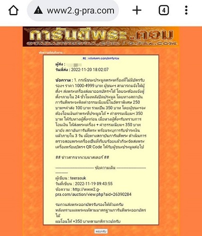 6.6 กรณีชนะประมูลพระเครื่อง ที่ไม่มีบัตรรับรองฯ ในช่วงราคา 1000-4999 บาท ผู้ชนะประมูล สามารถแจ้งให้ผู้ตั้งประมูล ส่งพระเครื่องมาตรวจสอบที่สถาบันการันตีพระ ** ก่อนโอนเงิน ** ได้ โดยผู้ชนะประมูลจะต้องแจ้งให้ผู้ตั้งประมูล ทราบภายใน 24 ชั่วโมงหลังปิดประมูลทางเมล์บ๊อกซ์เท่านั้น เมื่อผู้ตั้งประมูลได้รับแจ้งแล้ว จะต้องดำเนินการส่งพระเครื่องพร้อมแนบค่าธรรมเนียมในการตรวจสอบพระเครื่องอัตราพิเศษ 250 บาท + ค่าธรรมเนียมจัดส่งพระคืนทางพัสดุไปรษณีย์ EMS 100 บาท ( กรณีพระบูชาคิดตามอัตรานี้ ) รวมเป็น 350 บาท ( ค่าธรรมเนียมนี้จะคิดเฉพาะการออกผลพระแท้ออกบัตรฯได้และพระเก๊เท่านั้น หากทางสถาบันฯ ไม่ออกผลการตรวจสอบหรือออกผลแท้ยังไม่รับออกบัตรฯ ทางสถาบันฯ จะคืนค่าธรรมเนียมส่วนนี้จำนวน 150 บาทเป็นคูปองการันตีพระ ) และ ผู้ชนะประมูลจะต้องโอนเงินค่าพระเครื่องพร้อมค่าตรวจสอบพระเครื่อง 350 บาท ให้กับผู้ตั้งประมูลภายใน 3 วัน หลังจากมีการแจ้งผลการตรวจสอบทางหน้าเว็บไซต์ฯ และหากผู้ชนะประมูล ***ไม่ใช้สิทธิ์นี้ *** แสดงว่าผู้ชนะประมูลท่านนั้น ยินดีที่จะยอมรับปัญหาต่างๆที่จะเกิดขึ้น เมื่อมีปัญหาในการคืนพระเครื่อง หรือ มีปัญหาในการรับเงินค่าพระเครื่องคืน หากผลการตรวจสอบพระเครื่องเป็นพระแท้ แล้วผู้ชนะประมูลไม่ชำระเงินค่าพระเครื่อง ผู้ชนะประมูลจะต้องรับผิดชอบค่าธรรมเนียมในการตรวจสอบพระเครื่อง 350 บาทนี้ทุกครั้ง หากผู้ชนะไม่คืนค่าตรวจสอบนี้ ผู้ตั้งประมูลสามารถแจ้งเรื่องมาที่ไลน์แอด @g-pra.info ทางเว็บไซต์ฯจะติดตามค่าธรรมเนียมนี้ให้จนแล้วเสร็จ และผู้ชนะประมูลที่ได้รับ ** คำติ ** ด้วยเหตุผลไม่ชำระเงินค่าพระเครื่องที่ประมูลได้ จะไม่สามารถใช้กฎ กติกาข้อนี้ได้ และจะต้องโอนเงินค่าพระเครื่อง+เงินค่าตรวจสอบ 350 บาทให้ผู้ตั้งประมูลก่อนเท่านั้น |
