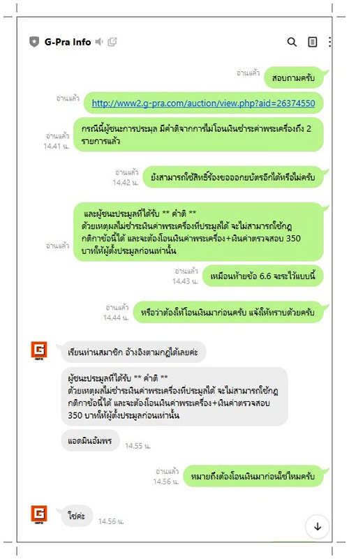 - หากผลการตรวจสอบพระเครื่องเป็นพระแท้ แล้วผู้ชนะประมูลไม่ชำระเงินค่าพระเครื่อง ผู้ชนะประมูลจะต้องรับผิดชอบค่าธรรมเนียมในการตรวจสอบพระเครื่อง 350 บาทนี้ทุกครั้ง หากผู้ชนะไม่คืนค่าตรวจสอบนี้ ผู้ตั้งประมูลสามารถแจ้งเรื่องมาที่ไลน์แอด @g-pra.info ทางเว็บไซต์ฯจะติดตามค่าธรรมเนียมนี้ให้จนแล้วเสร็จ และผู้ชนะประมูลที่ได้รับ ** คำติ ** ด้วยเหตุผลไม่ชำระเงินค่าพระเครื่องที่ประมูลได้ จะไม่สามารถใช้กฎ กติกาข้อนี้ได้ และจะต้องโอนเงินค่าพระเครื่อง+เงินค่าตรวจสอบ 350 บาทให้ผู้ตั้งประมูลก่อนเท่านั้น