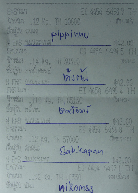 ได้จัดส่งของไปให้แล้ว 7/11/54 คาดว่าจะได้รับไม่น่าเกินวันพุธ นะครับ สำหรับในเขต กทม ที่มีปัญหาน้ำท่วม ได้โทรเช็คกับท่านที่จองที่ไห้เบอร์โทรติดต่อไว้ บางท่านก็ไห้จัดส่งได้เลย บางท่านฝากไว้ก่อน สำหรับท่านที่ไม่มีเบอร์ติดต่อ ก็จัดส่งไห้ ก่อนส่งก็สอบถามทางเจ้าหน้าที่ เขาบอกว่าในเขตที่มีปัญหาน้ำท่วมก็จะช้าหน่อย ถ้าจัดส่งผู้รับไม่ได้ของก็อยู่ทางไปรษณีย์สามารถติดต่อรับได้