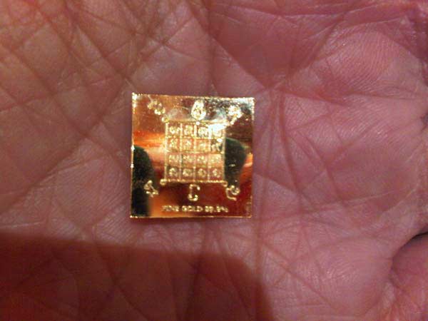 แต่เท่านี้ผมเองก็ปลื้มใจสุดๆ แล้ว! ครั้งแรกที่ได้จับตะกรุดตัวเป็นๆ ยังอดทึ่งในเทคโนโลยีของแพรนด้าไม่ได้ที่สามารถนำทองคำ 99.99% ทำเป็นแผ่นบางๆ และยิงเลเซอร์ยันต์ทั้งหมดลงไปโดยที่แผ่นทองคำไม่มีอาการไหม้บนพื้นผิวแต่ อย่างใด ต้องขอขอบคุณเลเซอร์ตัวจิ๋ว (แต่ผลงานไม่จิ๋ว) ที่สามารถสร้างยันต์อันสุดละเอียดยิบๆ ขึ้นมาได้ งานนี้ผมรับรองว่าถ้าไปรีดแผ่นทองคำแล้วใช้วิธีปั๊มยันต์ลงไปรับรองไม่ได้ ความคมชัดขนาดนี้แน่นอน |