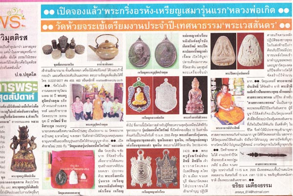 หนังสือพิมพ์ข่าวสดฉบับวันเสาร์ที่ 7 มกราคม 2555 คอลัมน์ วงการพระสุดสัปดาห์ ลงข่าวกับการเปิดสั่งจองวัตถุมงคลหลวงพ่อเกิดวัดเขาดิน รุ่น ปลดหนี้ทวีทรัพย์ ที่กำลังเปิดให้สั่งจองชุดกรรมการสุดคุ้มอยู่ในขณะนี้ ด้วยระยะเวลาอันสั้นเพียง 10 วันเท่านั้น ถึงวันที่ 15 มกราคม 2555 หมดก่อนปิดจองก่อน สอบถาม 084-145-2428 |