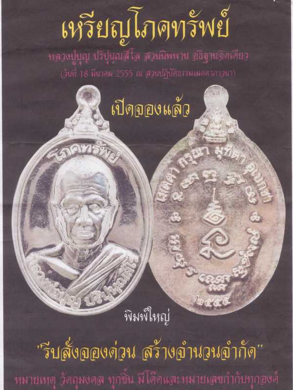 เหรียญหลวงปู่บุญ วัดปอแดง รุ่นโภคทรัพย์ แห่งสวนปฎิบัติธรรมเมตตาภาวนา (ดอนมะเฟือง) อ.ปักธงชัย