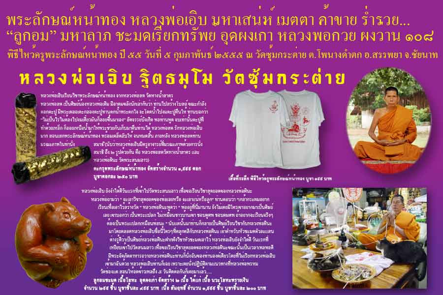 ขอเชิญร่วมพิธีไหว้ครูพระลักษณ์หน้าทอง ปี ๕๕ วันอาทิตย์ที่ ๕ กุมภาพันธ์ ๒๕๕๕ พิธี ณ วัดซุ้มกระต่าย ต.โพนางดำตก อ.สรรพยา จ.ชัยนาท ๑๗๑๕๐