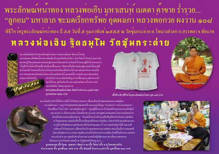 ขอเชิญร่วมพิธีไหว้ครูพระลักษณ์หน้าทอง ปี ๕๕ วันอาทิตย์ที่ ๕ กุมภาพันธ์ ๒๕๕๕ พิธี ณ วัดซุ้มกระต่าย ต.โพนางดำตก อ.สรรพยา จ.ชัยนาท