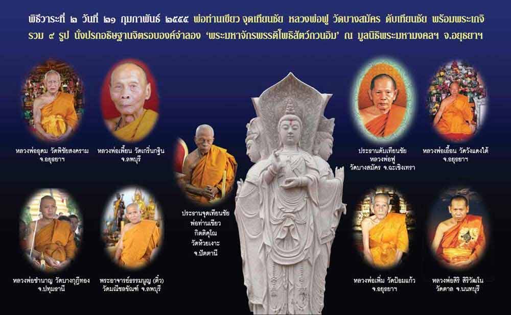 วันอังคารที่ 21 กุมภาพันธ์ 2555 พบกัน ณ มูลนิธิพระมหามงคลพุทธนิมิตอวโลกิเตศวร (พระโพธิสัตว์กวนอิม) ตําบลตลาดเกรียบ อําเภอบางปะอิน จังหวัดพระนครศรีอยุธยา ซึ่งเป็นสถานที่จะจัดสร้างเจ้าแม่กวนอิมองค์ใหญ่ที่สุดในประเทศไทย