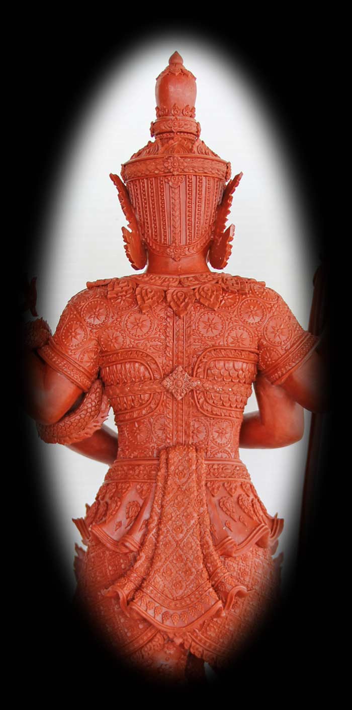 ด้านหลังพระบูชานั้นบางรุ่นที่เห็นทำกันมาก็ไม่ค่อยเน้นกันเท่าไรนัก แต่สำหรับผมแล้ว "ด้านหลังก็ต้องเป๊ะ" จึงเน้นทุกๆ ส่วนของลายผ้าไม่ว่าจะเป็นการกดพิมพ์ลายผ้าไทยมาปิดบนหุ่นเทียน หรือแม้แต่ลายแกะสดบนองค์หุ่นเทียนก็เน้นกันทุกๆ จุด เรียกว่าต้องการให้องค์หุ่นเทียนมีความคมชัดทุกๆ รายละเอียดเพื่อให้การถอดพิมพ์ออกมาแล้วสมบูรณ์แบบที่สุดครับ