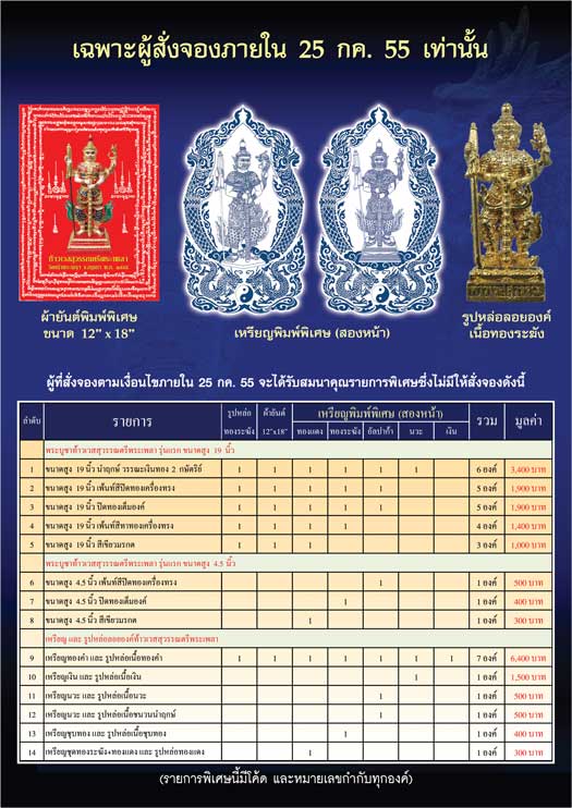 หลังจากที่ได้เห็นภาพ "เหรียญพิมพ์พิเศษ 2 หน้า" ท้าวเวสสุวรรณตรีพระเพลา รุ่น รวย เฮง สยบมหาอุทกภัยกันในปกหลังสุดของโบรชัวร์ท้าวเวสสุวรรณตรีพระเพลานั้น หลายๆ ท่ายสอบถามมาว่าเหรียญจะออกมาเป็นเช่นไร? จะได้เห็นก่อนที่จะตัดสินใจสั่งจองตามเงื่อนไขเพื่อที่จะได้รับเหรียญหล่อ 2 หน้านี้หรือไม่? |