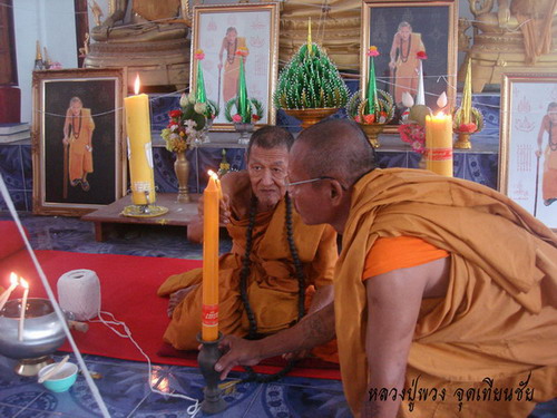 หลวงปู่พวง วัดน้ำพุสามัคคีองค์นี้ อายุ 87 ปี 66 พรรษา ( เกิด พ.ศ.2468 ) บวชเมื่อเป็นเณร อายุครบบวชพระก็บวชเลย เรียนวิชากับหลวงพ่อทบ มากที่สุด (น่าจะเป็นศิษย์ที่อยู่กับหลวงพ่อทบนานที่สุดในปัจจุบันนี้ ) หลวงพ่อทบรักมาก สอนให้หมด ทั้งพาไปฝากให้เรียนวิชากับหลวงพ่อเขียน ด้วยตัวของท่านเอง ตอนอยู่กับหลวงพ่อทบ ท่านมีหน้าที่ช่วยหลวงพ่อทบ จารตะกรุดมั่งม้วนมั่ง ถักมั้ง ตอนอยู่กับหลวงพ่อเขียน ท่านมีหน้าที่ตักน้ำใส่ถัง ให้หลวงพ่อเขียนทำน้ำมนต์ ต่อมาท่านฝากตัวเรียนวิชากับหลวงพ่ออ้วน วัดดงขุย ซึ่งเป็นที่รู้กันว่า หลวงพ่ออ้วนรับศิษย์ยากมาก ถ้าไม่เก่งจริงไม่มีพื้นฐาน ท่านจะปฏิเสธแต่กับหลวงพ่อพวง ท่านทดสอบจนแน่ใจว่า จิตดี บารมีสูง จึงรับเป็นศิษย์ต่อวิชาชั้นสูงให้