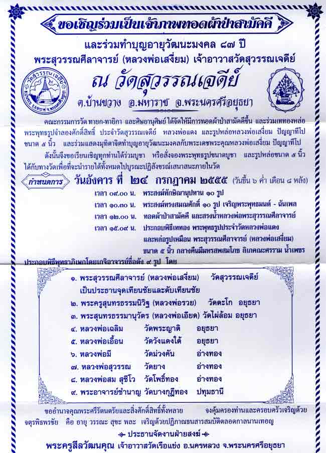 โดยทางคณะกรรมการวัดทุกๆท่าน ได้ขออนุโมทนาบุญในคุณงามความดีทั้งหลายในครั้งนี้ ขอบารมีสิ่งศักดิ์สิทธิ์ประจำวัดสุวรรณเจดีย์ รวมถึงบารมีหลวงพ่อเสงี่ยม วัดสุวรรณเจดีย์ โปรดได้ปกปักษ์รักษา คุ้มครองป้องกันให้ท่านพ้นจาก ภยันอันตรายทั้งหลายทั้งปวง อีกทั้งบุญกุศลจงหนุนนำให้ท่านและครอบครัวประสบแด่ความสุขความเจริญ ก้าวหน้าในชีวิต ให้มีแต่คนนิยมชมชอบและพบความสุขตลอดไปครับ