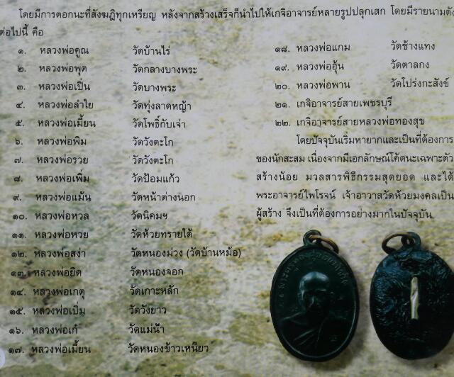 -รายนามพระเกจิอาจารย์ร่วมอธิฐานจิตปลุกเสก เช่น หลวงพ่อเฮง(ห่วย) วัดห้วยทรายใต้ ,หลวงพ่อหวล วัดนิคม , หลวงพ่อแถม วัดช้างแทง ,หลวงพ่อตัด วัดชายนา ,หลวงพ่อไพโรจน์ วัดห้วยมงคล ,หลวงพ่อแก้ว(มณี) วัดมฤคทายวัน ฯลฯ พระเกจิอาจารย์สายหลวงพ่อทองศุขวัดโตนดหลวง, สายเพชรบุรี, สายประจวบคีรีขันธ์, และสายอยุธยา |