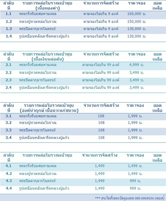 พระทุกพิมพ์มีการเททององค์นำฤกษ์และทุบเป้าเเบบโบราณที่วัด ในวันที่ ๒๐ ตุลาคม พ.ศ.๒๕๕๕ (วันเสาร์ห้า) โดยมีหลวงปู่แก้ว เป็นประธานในพิธี และพระเกจิสายใต้อีกหลายท่าน