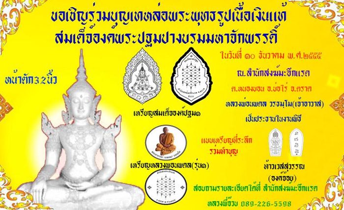 | หัวข้อกระทู้ : ขอเชิญร่วมบุญสร้าง หล่อพระ สมเด็จองค์ปฐม(ปาง)บรมมหาจักพรรดิ์ เนื้อเงินแท้ หน้าตัก 32 นิ้ว |