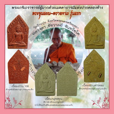 2. เนื้อผงว่าน 108 ด้านหลังฝังตะกรุด เกษา นขา(เล็บ) สีแดงแก่ว่านหลากหลายชนิดเพื่อให้มีความทนสิทธิ์ด้วยฤทธิ์ว่านทั้งหลาย มาผนวกกับพลังจิตของหลวงตาที่ได้แผ่ลงไปที่พระขุนแผน~พรายงามทำให้ยิ่งเพิ่มความขลังเข้าไปอีก เรียกว่ามีเกราะเพชรไว้ป้องกันภัยถึงเจ็ดชั้น คุ้มครองป้องกันอันตราย แคล้วคลาดดี กันแก้คุณไสยภูติผีปีศาจสิ่งอัปมงคลไม่ให้กร้ำกราย สร้าง 499 องค์ บูชาองค์ละ 300 บาท