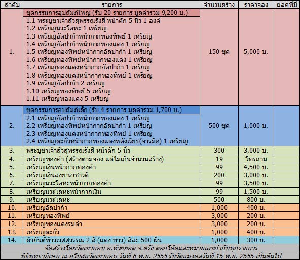 วัตถุประสงค์ในการจัดสร้าง : เพื่อสมทบทุนสร้างกำแพงแก้วอุโบสถ ณ วัดเขากอบ อ.ห้วยยอด จ.ตรัง